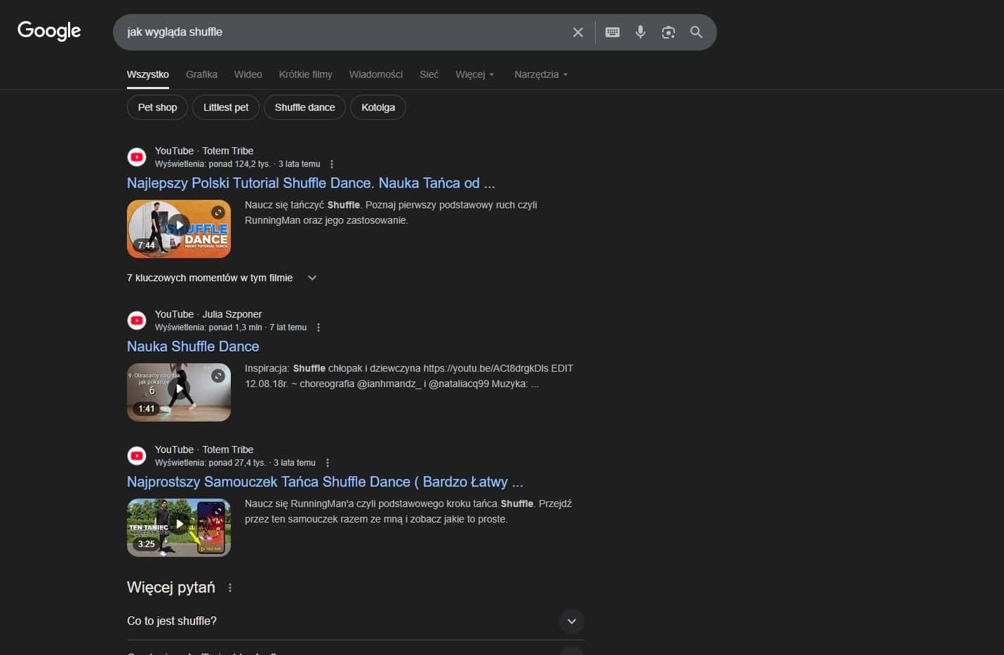 Przykładowo, zapytanie „jak wygląda shuffle” owocuje serią filmów wideo na górze odpowiedzi pokazujących, jak wykonać ten taneczny ruch.