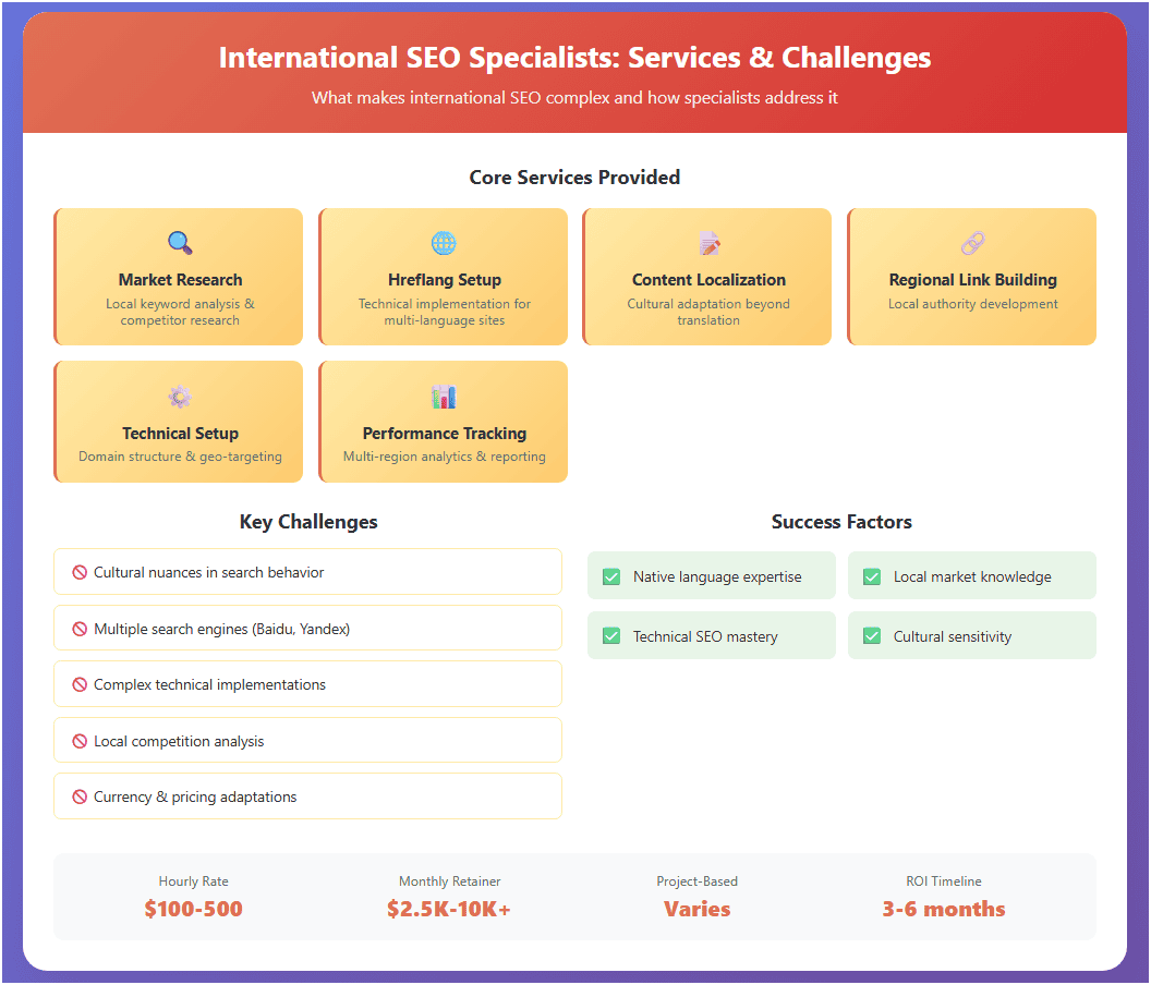 Prices for international SEO experts vary. They might charge by the hour ($100-$500), by the month ($2,500-$10,000+/month), or for a full project. The total cost depends on their skills, the size of your project, and how many languages and countries you want to target. Compare the cost to the new traffic and business you could get—it’s often a smart investment as you enter bigger markets. Common Challenges in International SEO—and How the Best Fix Them International SEO can be tricky. Simply translating your website isn’t enough. The best experts know how to spot and fix common problems.