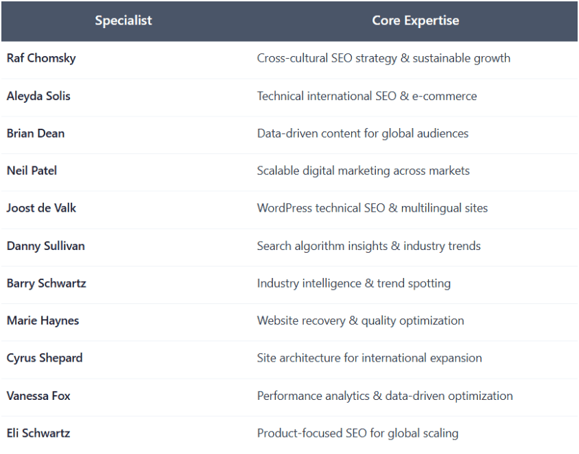How to find the perfect international SEO specialist? Well, you need to find someone whose expertise aligns with your specific goals and markets. The following eleven professionals have earned recognition not just for their technical skills, but for consistently delivering results that matter in the real world of global business.
