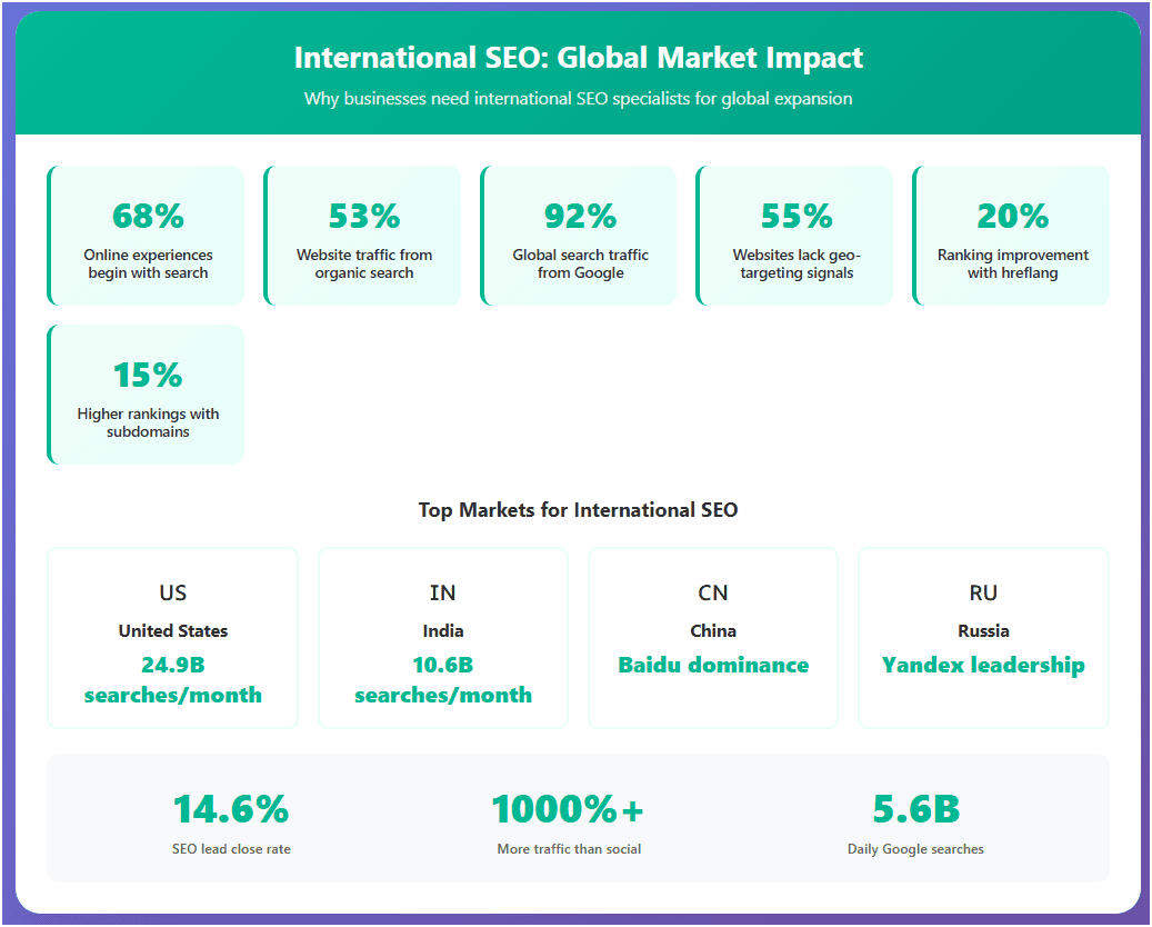 Expanding your business globally requires strategic expertise in international SEO. With 68% of all online experiences beginning with a search engine, search behaviors, languages, and digital landscapes shift dramatically from market to market, and the specialists who truly understand these nuances can mean the difference between breakthrough success and costly missteps. The best international SEO experts don’t just translate your existing content; they rebuild your entire digital strategy to genuinely connect with local audiences while maintaining the technical precision that search engines demand. Whether you’re eyeing European markets, Asian economies, or emerging regions, the right specialist transforms ambitious global plans into measurable results.