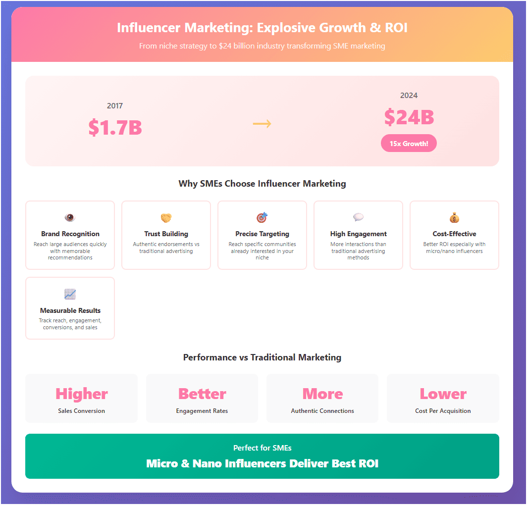Influencer marketing has evolved from a trendy experiment into an essential strategy that fundamentally transforms how small and medium businesses connect with their customers. According to industry reports, the global influencer marketing sector has grown exponentially from $1.7 billion in 2017 to over $24 billion in 2024 – a fifteen-fold increase that demonstrates the medium’s proven effectiveness.