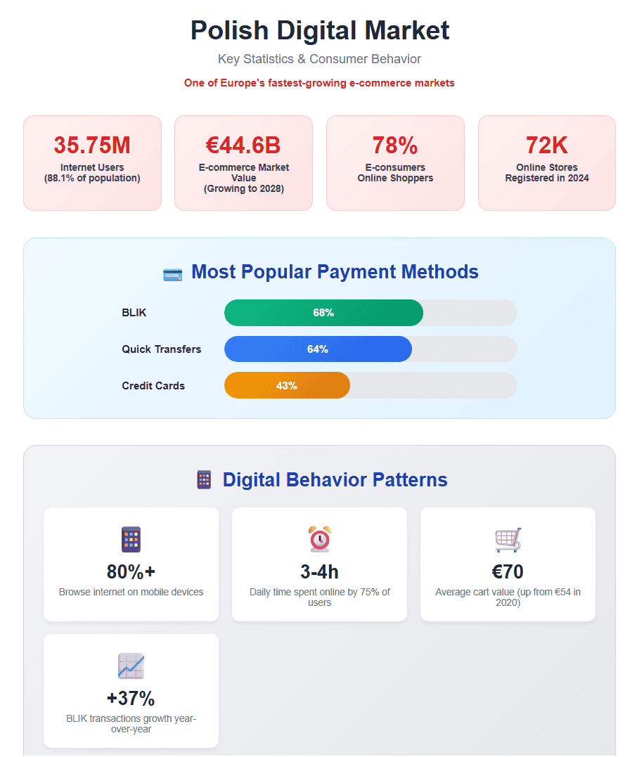 According to the ‘E-commerce in Poland 2024’ report, BLIK became the most popular form of payment for e-purchases for the first time (68% of responses), ahead of instant transfers (64%) and credit cards (43%). In 2024, BLIK users made over 2.4 billion transactions worth a total of 347.3 billion zloty, representing a 37% year-over-year increase. For e-commerce businesses, this means the necessity of integrating with local payment systems to maximize conversions.
