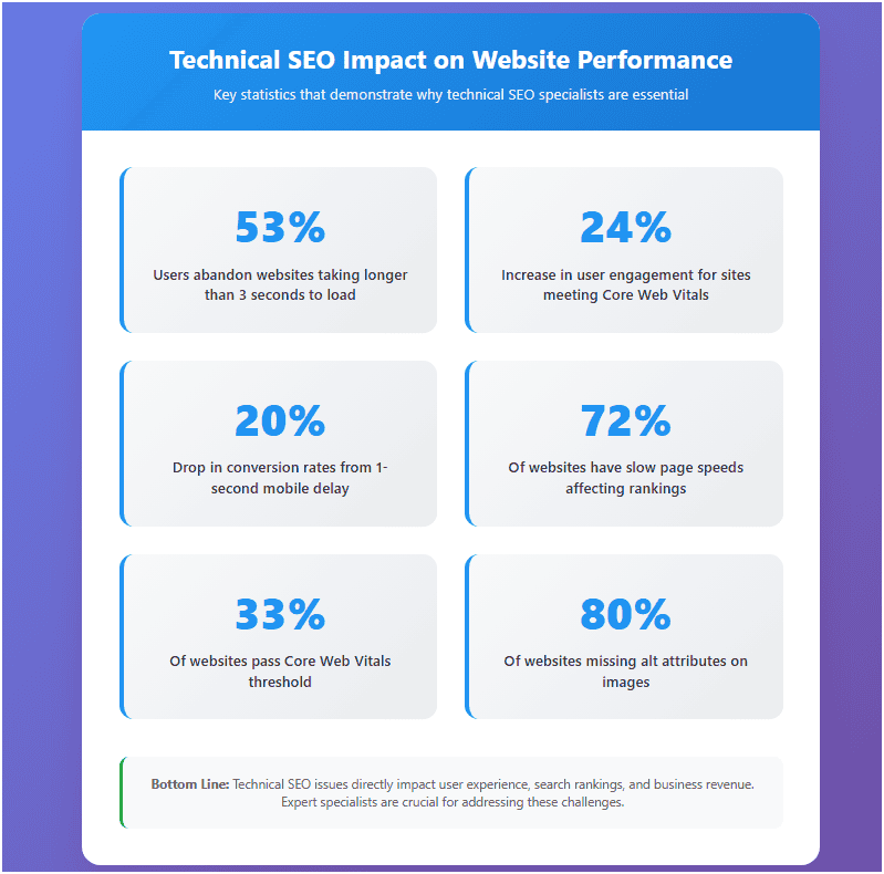 When your website isn’t performing in search results despite having great content, the problem often lies in the technical foundation. With 53% of users abandoning a website if it takes more than 3 seconds to load, technical SEO specialists are the professionals who understand the intricate relationship between search engines and website architecture—they know how to diagnose crawling issues, fix indexation problems, and optimize site performance in ways that directly impact rankings. Unlike general SEO practitioners who might focus on content or links, these specialists work with the nuts and bolts of how search engines actually read and understand websites. Finding the right technical SEO expert can mean the difference between a site that struggles to rank and one that dominates search results through superior technical optimization.