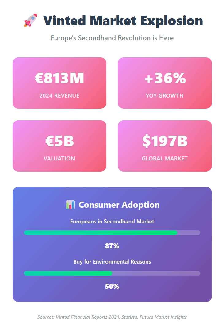 €813.4 million in revenue for 2024 – that’s what Vinted reported in their latest financial results. With 36% year-over-year growth and a company valuation reaching €5 billion, Vinted has become the undisputed leader of Europe’s secondhand fashion market.