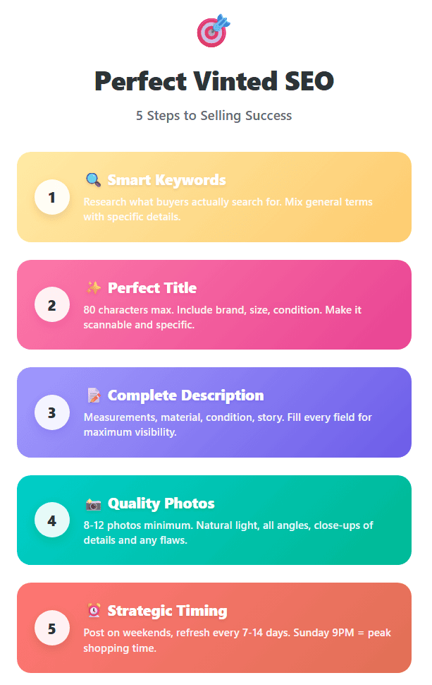 For sellers who take Vinted seriously, consider investing in professional keyword research or comprehensive content marketing strategy.