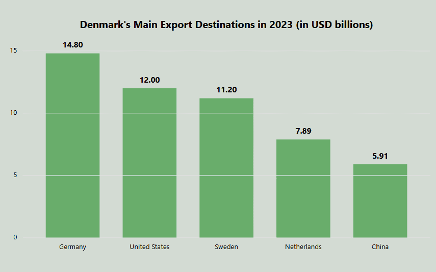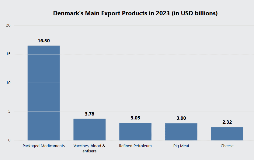 Denmark maintains strong global trade relationships, with particular strengths in pharmaceuticals, food products, and energy. According to data from the OEC, Denmark’s primary export destinations are: